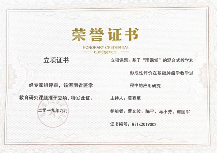 专门从事肿瘤学方面相关教学改革的活动同样呈现出极为活跃的态势,其中,《基于"雨课堂"的混合式教学以及形成性评价在此基础肿瘤学教学具体过程中的应用研究》这种情况获得经由河南省卫健委做出立项之举,《转化医学理念之下的基础肿瘤学课程具体改革与相关实践》同样获得郑州大学正式立项,而且该团队另外还发表数量可观的多篇用于有关教学研究的系列论文。