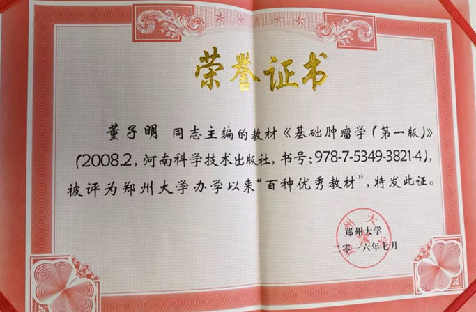 参与《病理生理学基础》编撰工作成为编委的当中有杨婉景、陈新焕,该教材于2017年被郑州大学出版社正式出版出来啦,它属于“十三五”高等教育医药院校规划教材范畴。董子明教授担任主编所编写的《基础肿瘤学》教材,还荣获了郑州大学“百种优秀教材”这份荣誉呢。